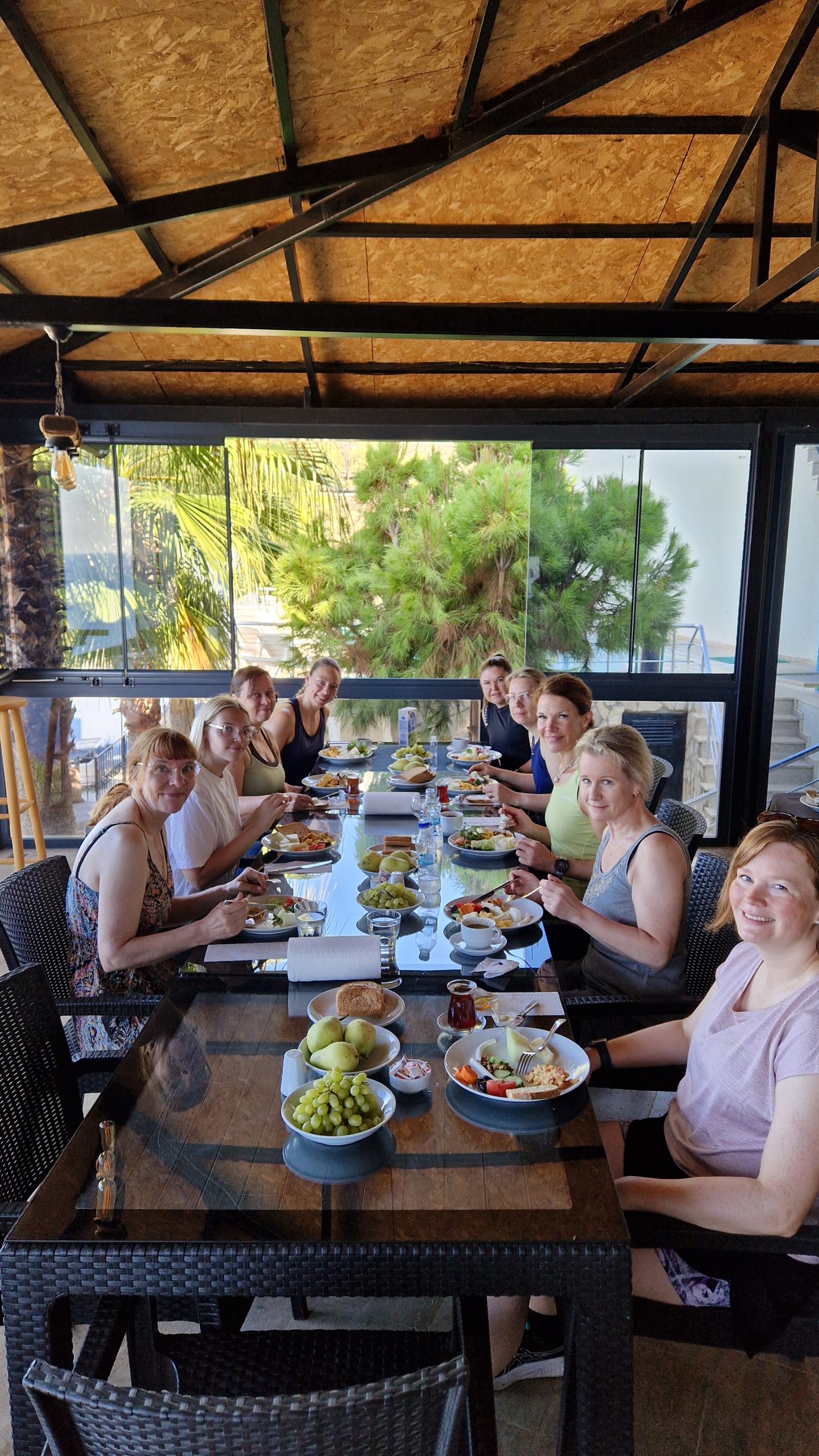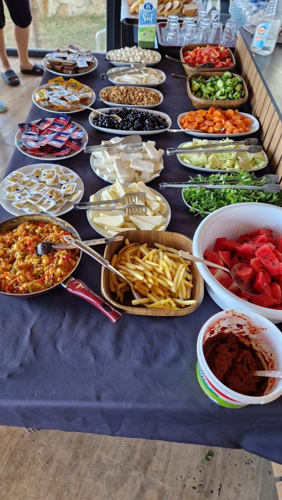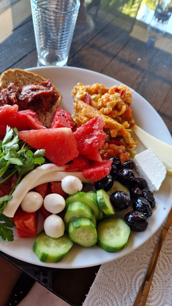 Aamuharjoitusten jälkeen oli aamupala; tuloaamuna poikkesimme Ilonan ystävien Happy Bistro-ravintolaan aamiaiselle, ja muina aamuina söimme Blue Lagoon Villagessa turkkilaisen aamiaisen, joka sisältää paljon kasviksia, munakasta ja juustoja. Aamiainen ravitsee pitkälle päivään, joten matkalla retkelle kävimme ostamassa eväitä mukaan ja söimme seuraavan aterian vasta illalla eri ravintoloissa vieraillen. Paikalliset tuttavat auttoivat osittain ruokapaikkojen valinnassa ja pöytävarausten tekemisessä. Ilona on luontainen verkostoituja, mikä kantaa niin yrittämisessä kotimaassa kuin kokemusmatkoillakin!